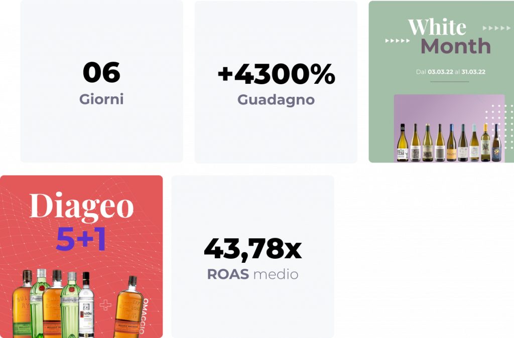 La divulgazione sui canali di social delle offerte per l’e-commerce e dei nuovi contenuti originali per il magazine hanno permesso di massimizzare l’efficacia di queste iniziative e di ottimizzare costi e ricavi. Lato ADV, le offerte create dal reparto commerciale di Drinkside, vengono trasformate in campagne che hanno performato incredibilmente fino a raggiungere un ROAS di 43x e ricavi del 4300%.