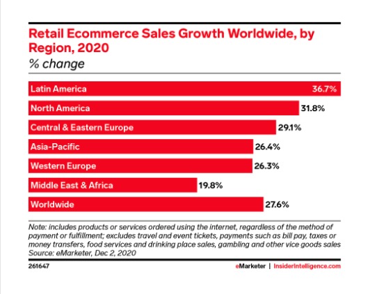 Secondo eMarketer, nel 2020 la crescita del settore e-commerce è schizzata al +27,6%, sicuramente agevolata dalla pandemia di Covid-19.