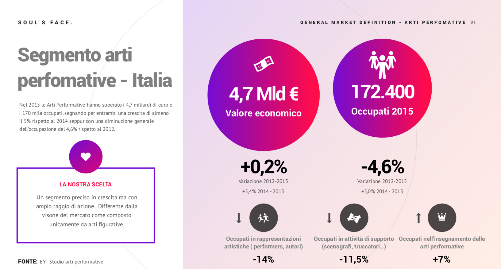 Ci siamo buttati su un mercato più di nicchia, e dalle varie analisi abbiamo individuato quello giusto: il settore delle arti performative. I punti di forza sono la viralità del contenuto, le poche restrizioni, il potenziale aggregativo e la forte inclusione.